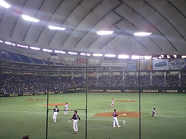 2枚目⇒試合前の日本選手の練習風景・・・自分達が座った席は一塁側の割とグランドに近いとこだったので結構大きく写真取れるかなーって思ってたんですが、やっぱり携帯のカメラでは限界がありました(T-T) 取りあえず雰囲気だけでも・・・